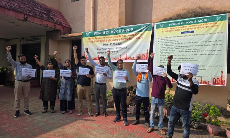 भाटापारा, 23 सितम्बर 2025: आज पूरे देश के साथ-साथ कृषि विज्ञान केंद्र (केवीके), भाटापारा के परिसर में भी एक ऐतिहासिक आंदोलन की गूँज सुनाई दी। Forum of KVK & AICRP के राष्ट्रव्यापी आह्वान पर, इन्दिरा गांधी कृषि विश्वविद्यालय के प्रशासनिक नियंत्रण मे कार्यरत इस केंद्र के समस्त कर्मचारियों ने “कलम बंद हड़ताल” एवं प्रदर्शन कार्यक्रम का आयोजन किया। यह आंदोलन भारतीय कृषि अनुसंधान परिषद (आईसीएआर) की भेदभावपूर्ण नीतियों के विरोध में और “वन नेशन, वन केवीके, वन पॉलिसी” की माँग को लेकर किया गया, जो देशभर के गैर-आईसीएआर केवीके कर्मचारियों की लंबे समय से चली आ रही माँग है।