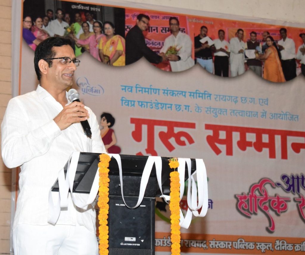 रायगढ़। गुरू पूर्णिमा के पावन अवसर पर संस्कार पब्लिक स्कूल के सहयोग से नव निर्माण संकल्प समिति एवं विप्र फाउंडेशन के संयुक्त तत्वाधान में जिले के 300 से अधिक शिक्षकों एवं सामाजिक क्षेत्र, संगीत क्षेत्र, चित्रकला क्षेत्र, पर्यावरण क्षेत्र आदि से संबंधित का सम्मान समारोह भव्य रूप में पंजरीप्लांट ऑडिटोरियम में रविवार को संपन्न हुआ। कार्यक्रम संयोजक रामचन्द्र शर्मा ने बताया कि मुख्य अतिथि पूर्व शिक्षा मंत्री सत्यनारायण शर्मा, कार्यक्रम अध्यक्ष पूर्व विधायक विजय अग्रवाल, विशिष्ट अतिथि चरण शर्मा, रिटायर्ड प्राचार्य पी.एस.खोडिय़ार, आर.के.तंबोली, प्रो. अभय पांडे, सुभाष त्रिपाठी, रमेश अग्रवाल, सुभाष पांडे, मुकेश जैन, दीपक पांडे, अनिल शुक्ला, नगेन्द्र नेगी, विप्र फाउंडेशन के जिलाध्यक्ष विजय शर्मा, महिला अध्यक्ष श्रीमती बीना शर्मा, शिव शर्मा, जेठूराम मनहर, संस्कार स्कूल की प्राचार्या श्रीमती रश्मि शर्मा, श्रीमती आशा त्रिपाठी की उपस्थिति में सम्मान समारोह आयोजित हुआ।