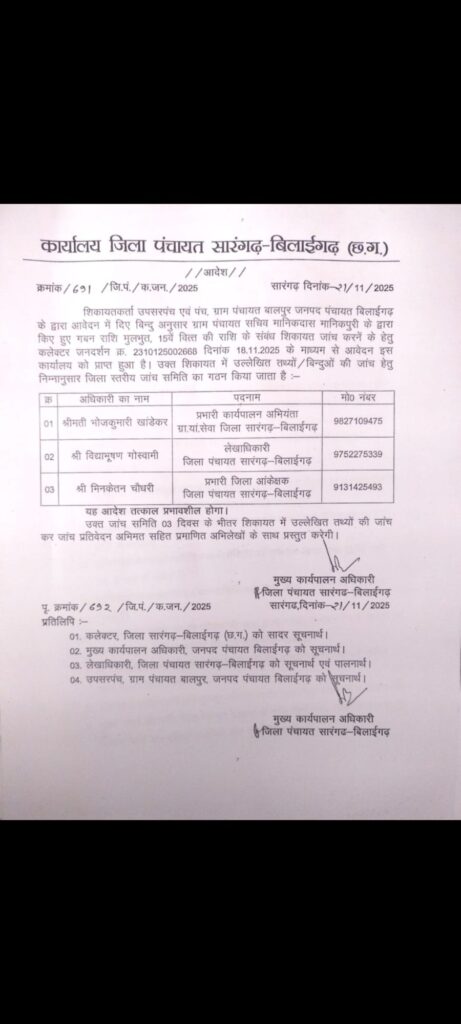 सरसीवां //ग्राम पंचायत बालपुर, जनपद पंचायत बिलाईगढ़ में पंचायत सचिव पर गंभीर अनियमितताओं और भ्रष्टाचार के आरोपों को लेकर प्रशासन ने सख्त रुख अपनाया है। जनदर्शन बैठक दिनांक 11 नवंबर 2025 एवं 18 नवंबर 2025 को प्रस्तुत आवेदनों पर कार्रवाई करते हुए जिला पंचायत द्वारा जिला स्तरीय जांच समिति का गठन किया गया है।